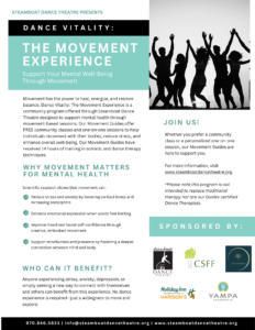 As a community-focused organization, SDT collaborates with other area non-profits and local organizations to bring free or affordable classes to all demographics. At least once a year we host a professionally trained dancer coming to the area to teach, and host “dance on film” series to showcase this beautiful artform.